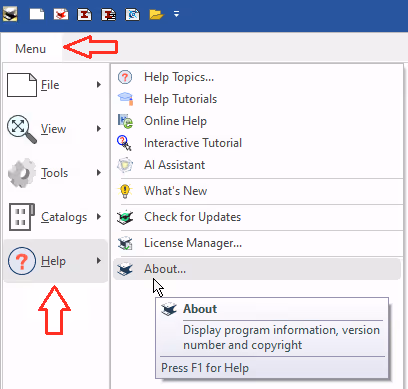 Där visas aktuell version i överkanten av fönstret som kommer fram. Överst ser man "produktårsmodell" (rödmarkerad text IRONCAD 2025 nedan), därefter "versionsnumret" (rödmarkerad text 27.0 Product Update 1 Service Pack 1 nedan). Man kan även jämföra det s.k. "build number" (rödmarkerade siffror 19811 nedan).