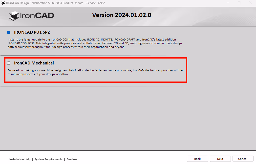 Avmarkera IronCAD Mechanical, tryck sedan på Next