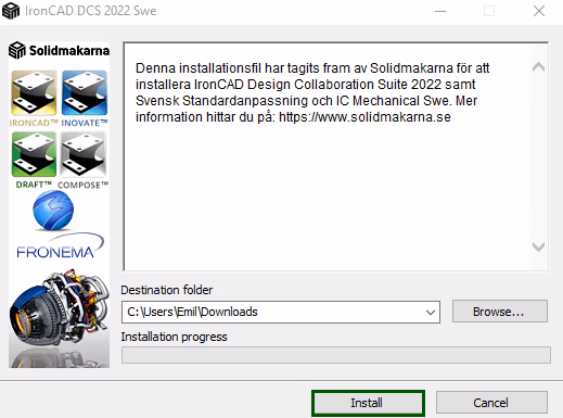 Vid val av “Anpassad installation” kan ni bl.a. ändra sökväg för installationen. Klicka på Install för att påbörja installationen.