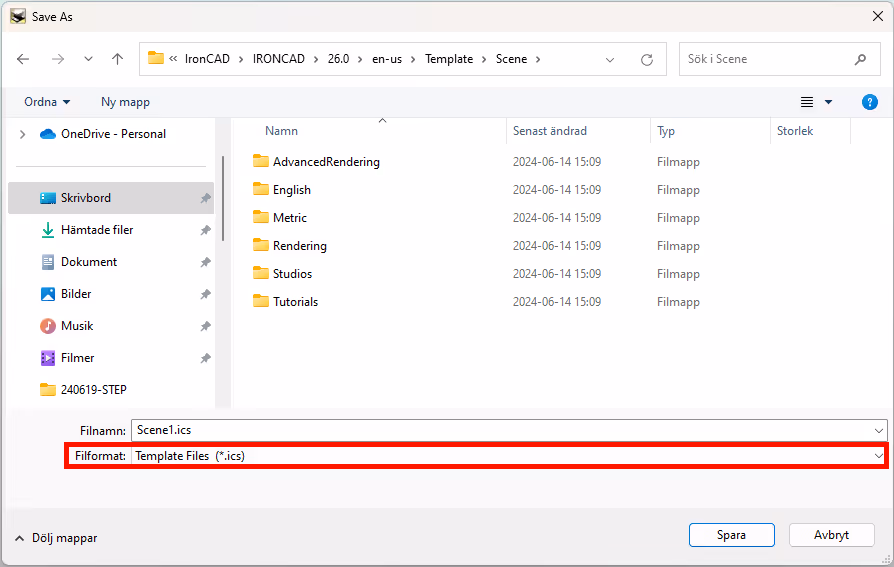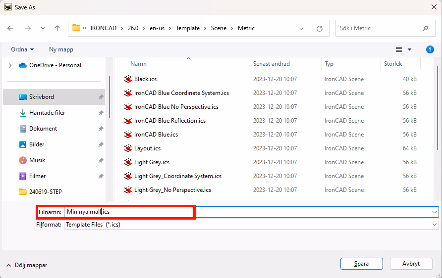 Varje mapp därunder motsvarar en flik med 3D-mallar i IRONCAD (se överkanten av sista bilden längre ned). Här kan du skapa en egen mapp som hanterar dina egna mallar eller använda en befintlig mapp/flik där du kan lägga din nya mall.
