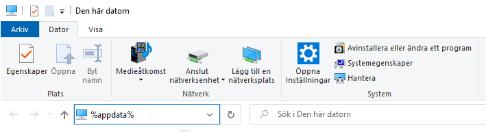 Markera adressfältet längst upp till vänster och ta bort all information. Skriv sedan %appdata%.