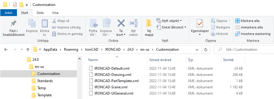 Detta öppnar en mapp där olika mappar och filer kopplade till just din unika Windows-inloggning finns. Leta dig vidare genom mapparna IronCAD, IRONCAD, "versionsnummer", en-us och slutligen mappen Customization.