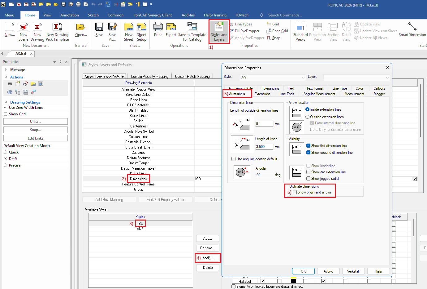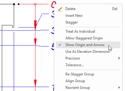 Svar: På enskilda måttkedjor högerklickar man på 0-måttet och stänger av "Show Origin and Arrows".