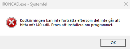 IRONCAD (och många andra program) är byggda med Microsofts utvecklingsverktyg från 2015. Dessa program kräver vissa "runtime-bibliotek" för att fungera. En av filerna heter mfc140u.dll. När den saknas får du detta fel.