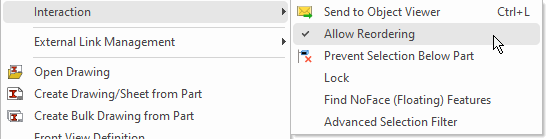 Det finns en patenterad teknik i IRONCAD som automatisk hanterar features ordning i trädstrukturen under en part. Vi rekommenderar att man stänger av denna funktion när modellen börjar bli mer komplex och den exakta ordningen på alla eller vissa features är väldig viktig. Denna automatik kan ibland kliva in och flytta t.ex. en Blend feature längre ned i trädet eller en Shape feature hamnar överst, eftersom tekniken är satt att förebygga vissa förutsättningar.