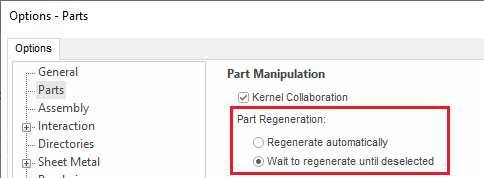 Under Options, Part, finns en inställning där man kan välja mellan "automatisk regenerering" av features eller inte. Det innebär att man med standardinställningen Regenerate Automatically alltid räknar om minsta lilla förändring i modellen precis när den sker. T.ex. om man drar ett hål med TriBall så kommer den första förflyttningen att regenerera modellen, sedan "lyser måttet upp" och man skriver in exakt var hålet ska placeras = ytterligare en regenerering. Detta är oftast inget problem i "vanliga" modeller. Det tar bråkdelar av en sekund och man hinner oftast inte ens uppfatta det.