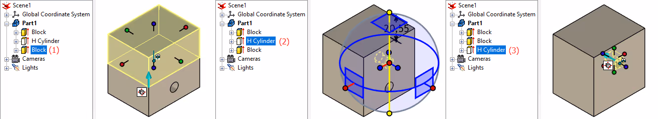 (1) En positiv extrudering i form av ett Block läggs till efter hålet H Cylinder i partens trädstruktur.