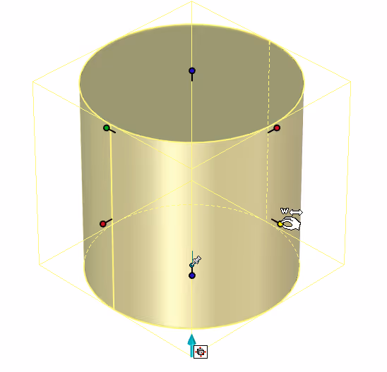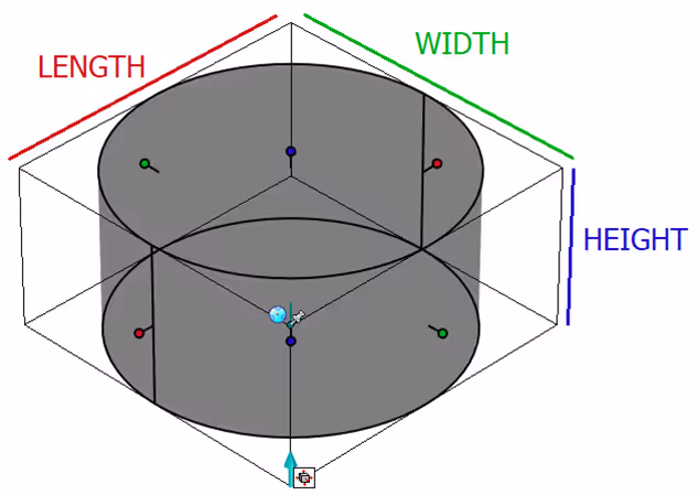 Det är alltså den här ”virtuella lådan” som man ändrar form på och geometrin däri måste hänga med på något sätt. För en rund Cylinderform blir det då per automatik alltid W- och L-handtagen som representerar dess "diameter". H-handtaget motsvarar i sin tur alltid ”extruderingshöjd” (ja, det är kanske enklare att säga längd, men L är ju "redan upptagen" av Length-handtaget för Sizeboxens längd).