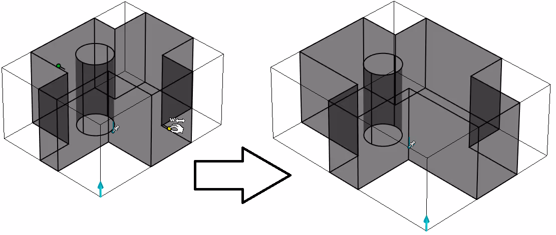 Om man drar i W-handtaget kommer dels sketchens linjer i den riktningen att bli längre, men linjerna som går i L-riktning kommer även att ”följa med” och flytta sig motsvarande mycket och vice versa. Se bilden nedan.